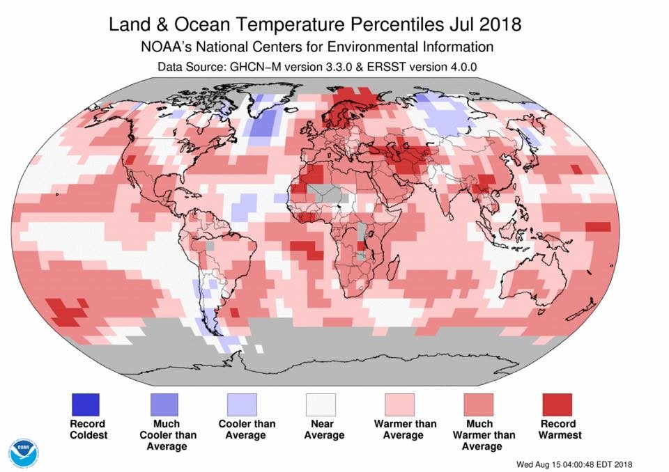 根據NOAA資料顯示,今年7月全球平均溫度達16.55°C,這是自1880年有現代分析以來的第4高溫。氣象局副局長鄭明典指出,顯著高溫區由北歐往南到中亞及非洲北部地區,最明顯的低溫區則是在俄羅斯中部。不過,因台灣位於冷熱交界處,所以相對來說不算特別熱。