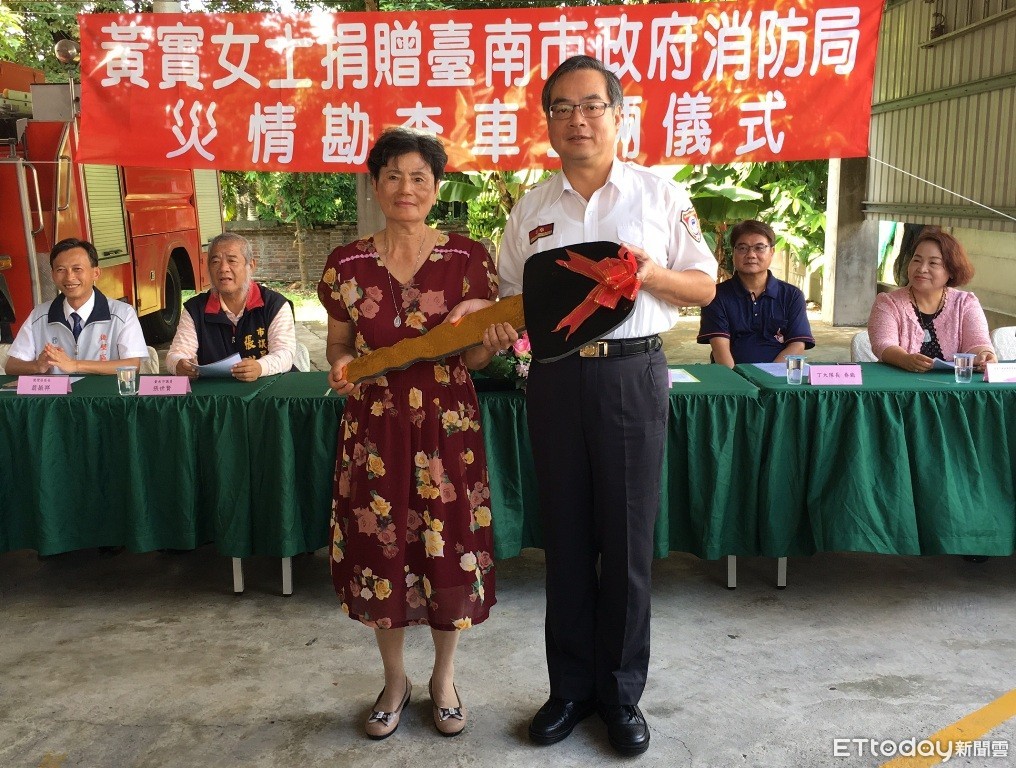 ▲黃實女士代表捐贈台南市消防局第一大隊後壁分隊災情勘查車1輛,由消防局副局長楊宗林代表接受。(圖/記者林悅翻攝,下同)