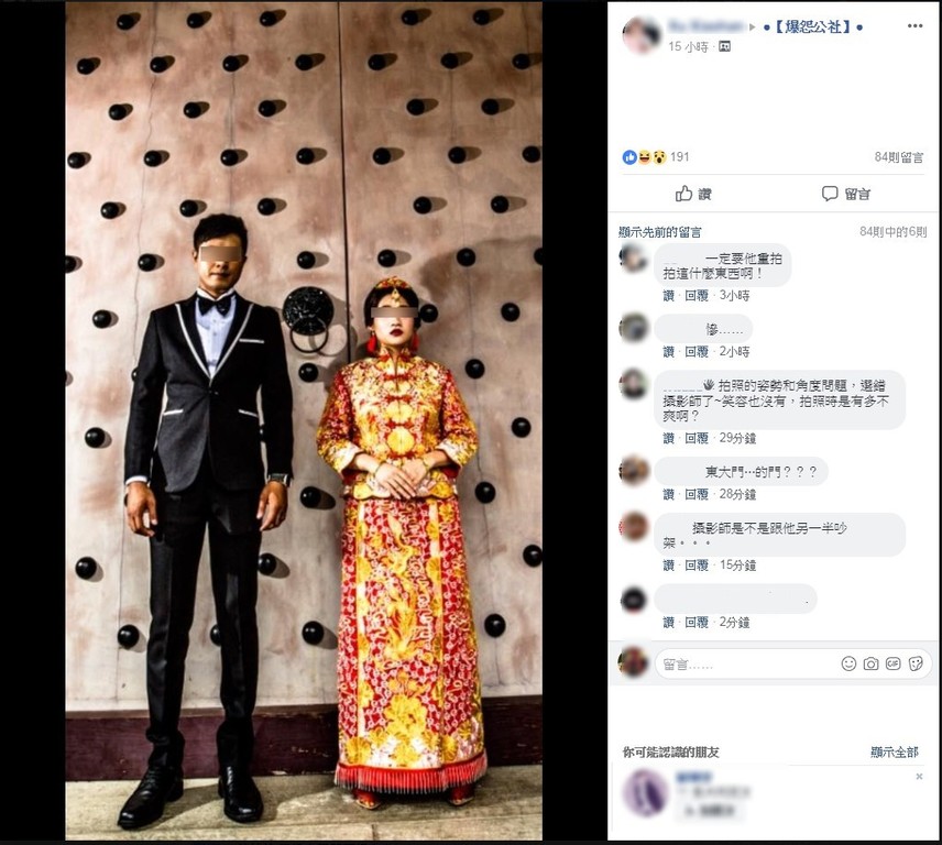 網友看了照片紛紛表示「男的其實還好,女方比較像……」、「真的不懂他的藝術啊」、「禮服不是自己選的嗎?」、「好慘的婚紗照」、「換間重拍吧」、「婚紗我覺得沒有什麼問題啊,應該是想走這種風格結果修圖的模式太重吧」。