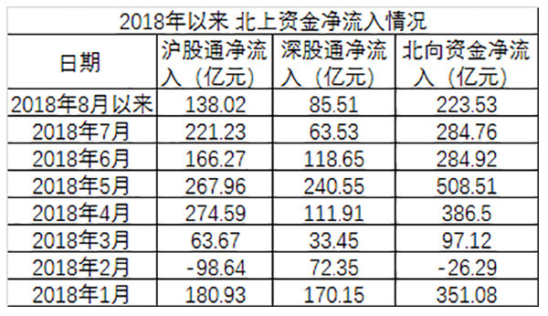 萬得數據顯示,滬深港通2018年合計淨買入金額超過2000億元,其中除了2月北向資金淨流入為-26.29億元,其餘月份都是正向的淨流入。在第二季度,4月份通過滬深股通淨流入的北上資金97.13億元驟增至386.5億元,5月的淨流入規模更達到508.51億元。
