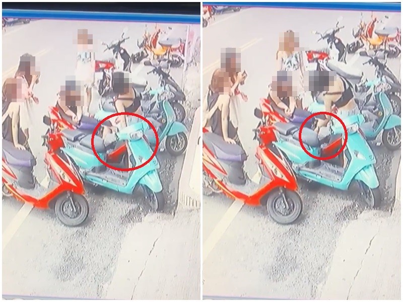 畫面中可以看見,一群少女將車子停在店家門口,短髮少女欲牽車出來卻被卡住,後來她突然下車往前走,看了看自己的腳,似乎被燙到、不斷呼呼小腿,沒想到接下來竟伸手將旁邊亮藍色機車的鑰匙拔掉、丟在地上,再騎車離去。