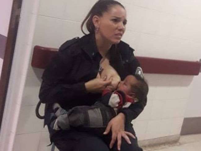 外媒報導,阿根廷一名女警日前在一家兒童醫院執勤時,發揮愛心為一名哭泣的嬰兒解衣哺乳。照片上傳到社群媒體後,被網友熱讚是「英雄」、「最美警花」。