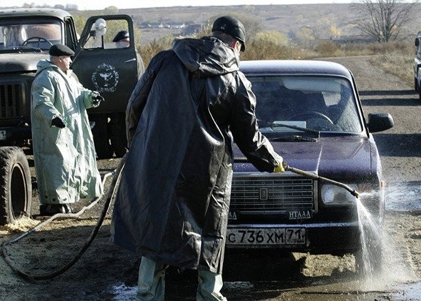 ▲因應疫情,羅斯衛生部門工作人員對往來車輛進行檢疫消毒。(圖/翻攝自大陸網站)