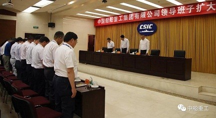 ▼中船重工領導班子在會議前全體起立為罹難的3名同仁默哀致敬。(圖/翻攝自中船重工官方微信)