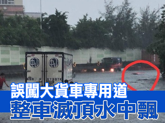 突如其來的雨勢與風力,讓高雄多處傳淹水災情,就連大貨車專用道都變成「河道」,讓不少運將傻眼。一名聯結車駕駛今早行經前鎮區草衙路與金福路的大貨車專用道時,發現一輛誤闖的紅色轎車被大水困住,最後更幾乎滅頂,於是立刻拍下畫面,直呼「都標示『大貨車專用道』了你還...真是不聽話。」