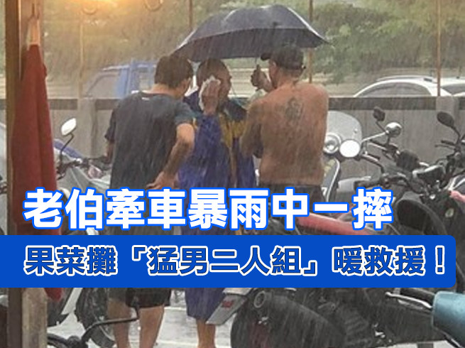 受到熱帶性低氣壓影響,狂風暴雨無情肆虐南台,但在台南市安南區的果菜批發市場前,卻出現滿滿溫情的畫面。一名老阿伯今從市場離開時,在牽車的過程中不慎摔倒,果菜攤「猛男二人組」見狀立刻伸出援手,甚至冒雨幫老伯擦拭,讓網友們不禁豎起大拇指狂讚。