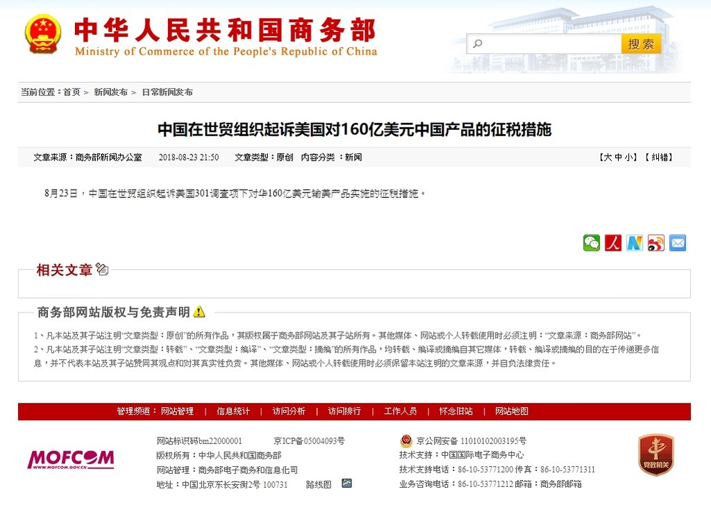 ▲中國於8月23日在世貿組織起訴美國「301調查」的徵稅措施。(圖/翻攝自中國商務部官網)