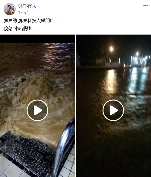 民眾「似乎有人」指出屏東科技大學門口淹水,讓他連回家都難,他同時拍攝二段影片,只見商店前的水溝蓋已變成噴泉,不斷湧出黃色泥水,而前方馬路更是變成湍急小河,民眾行經在上面時只能苦中作樂要大家看整條馬路的慘狀。影片引起不少討論,有網友說沒經過「壽比河」的洗鍊就不是真正的「屏科人」。