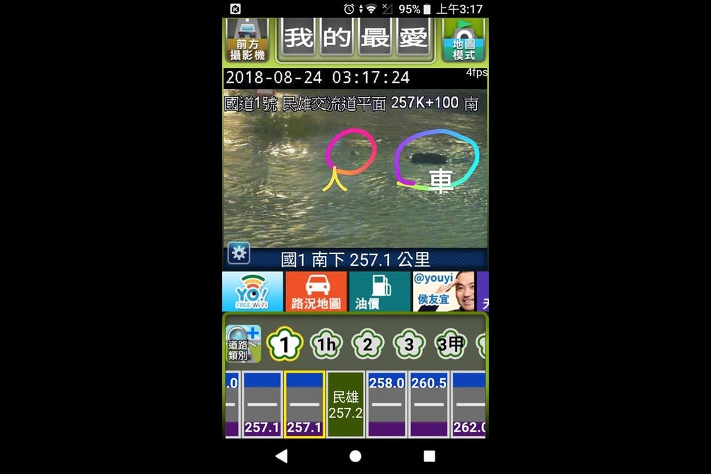 受到熱帶低氣壓影響,南部各地下起暴雨,造成許多地區淹水。一位網友使用APP查看國到路況時,發現竟然有車子被淹到滅頂,駕駛在水中載浮載沉,所幸之後順利脫困。