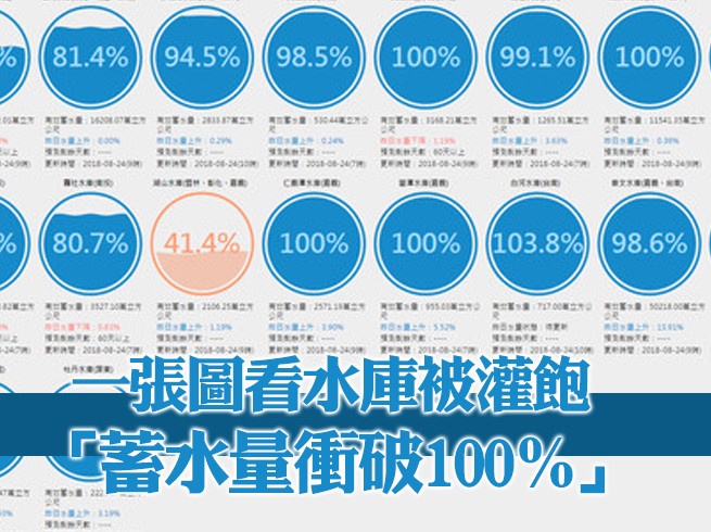 網站《用數據看台灣》 將經濟部水利署資料製作成「台灣水庫即時水情」圖,可以看出新竹寶山第二水庫、台中苗栗的鯉魚潭水庫、嘉義仁義潭及蘭潭水庫、台南白河水庫和烏山頭水庫、台南高雄的南化水庫,蓄水量都在100%以上。