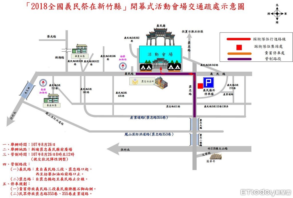 ▲2018年義民祭活動踩街路線圖與交通管制資訊。(圖/記者陳凱力翻攝)