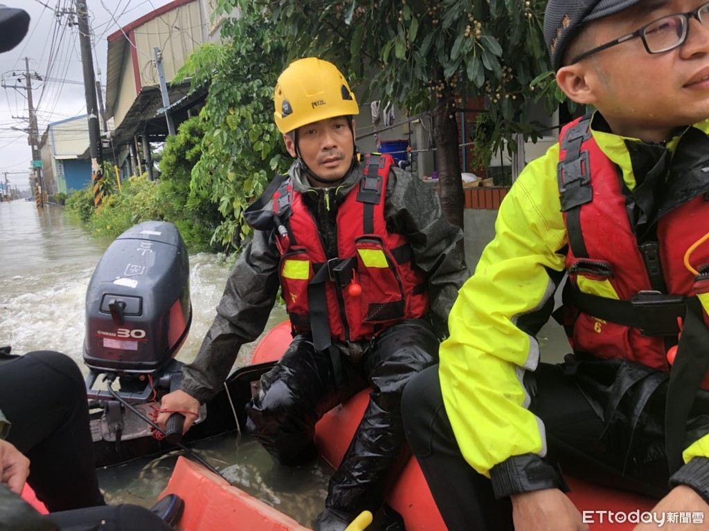 ▲高雄岡山嘉興里潭底路社區,水淹兩層樓,消防隊員運送便當。(圖/記者宋德威攝,下同)