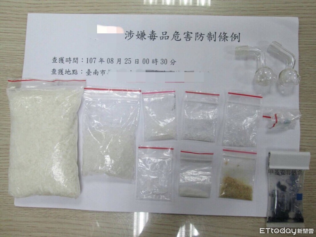 ▲台南市仁德分駐所在善化區套房查獲陳姓女子二人涉嫌吸毒,及持有各式毒品一批。(圖/記者林悅翻攝)