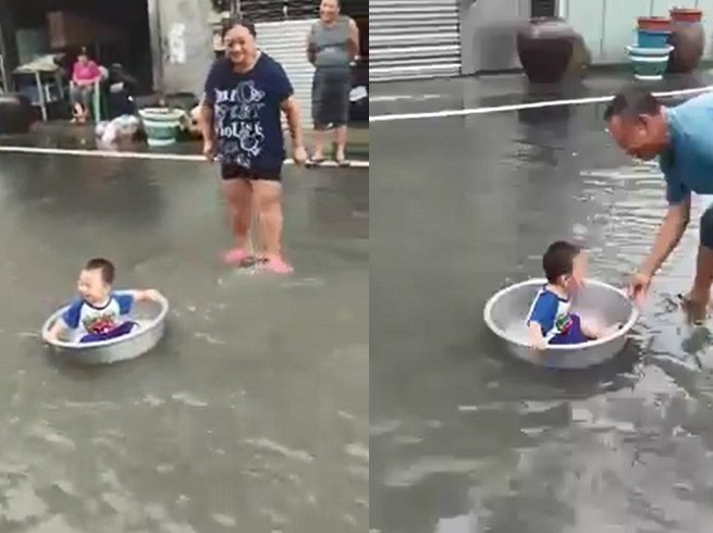 熱帶低壓帶來強降雨,讓南台灣許多地區都淹水。有民眾為了自救,拿出自製船筏來因應,沒有船筏的,就用充氣救生船來應急。但是還是比不過這個小孩的交通工具,因為他直接就是坐在大澡盆上漂浮,被網友戲稱是「桃太郎」。