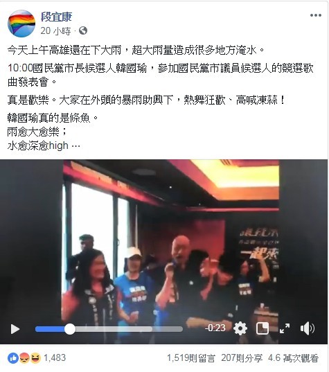 段宜康昨(24)日在臉書PO文透露「今天上午高雄還在下大雨,超大雨量造成很多地方淹水。10:00國民黨市長參選人韓國瑜,參加國民黨市議員參選的競選歌曲發表會。真是歡樂。大家在外頭的暴雨助興下,熱舞狂歡、高喊凍蒜!」段宜康酸「韓國瑜真的是條魚。雨愈大愈樂;水愈深愈high ⋯」