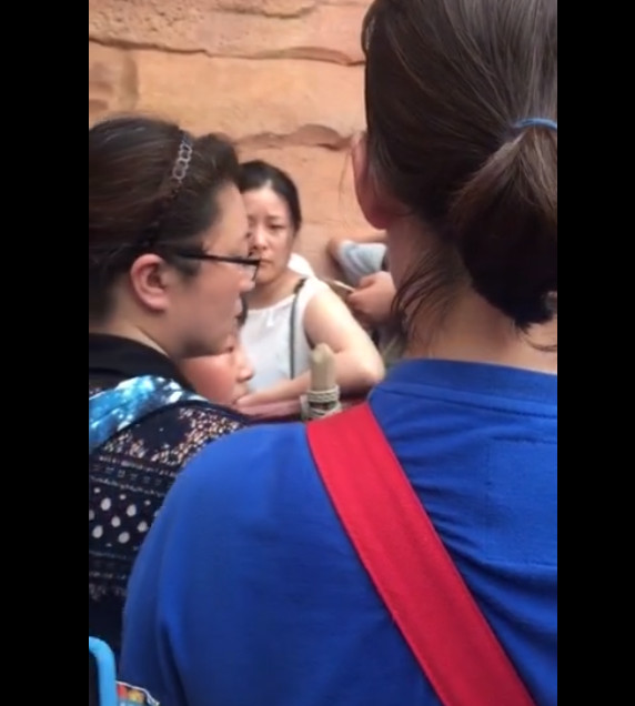 工作人員遭到男童辱罵後,立刻不滿的表示,「你再說一遍!你再重複一遍!」隨即男童母親立刻摀住兒子的嘴巴,其中就是因為身旁其他排隊的遊客已紛紛拿起手機錄影,男童母親也怒吼「再給我錄!給我刪了!」
