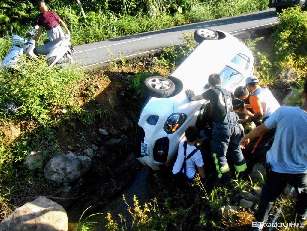 ▲▼ 情侶開車赴金山財神廟拜拜 不慎衝入邊坡翻覆。(圖/記者郭世賢翻攝,同下)
