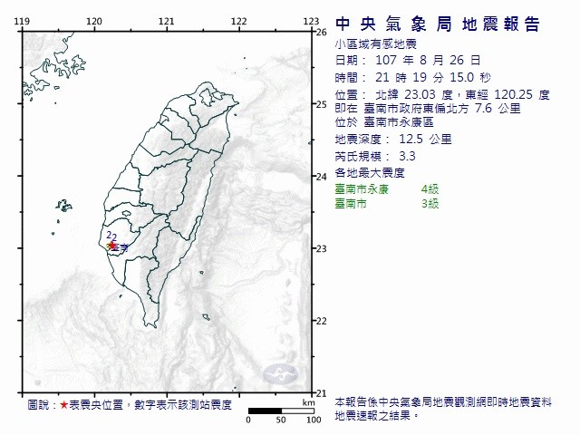 氣象局地震測報中心資料顯示,26日晚間21時19分,這起地震震央位於台南市永康區,即台南市政府東偏北方7.6公里處,地震深度12.5公里,規模3.3,台南市永康4級、台南市3級、善化及佳里測得2級。