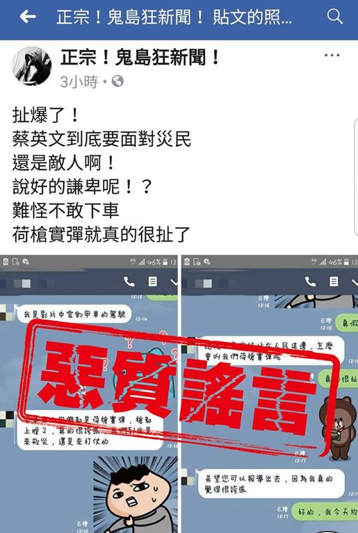 社群網站上名為「正宗!鬼島狂新聞!」粉絲專頁指出,總統蔡英文搭乘雲豹甲車在勘災時,車上官兵配實彈,甚至還上膛。對此,國防部澄清,該臉書所述實為惡意散播虛假訊息、謠言,蓄意攻訐國家元首和國軍,製造軍民對立與不安。嚴正譴責此種散布不實訊息的低劣行徑,將立即依法提告。