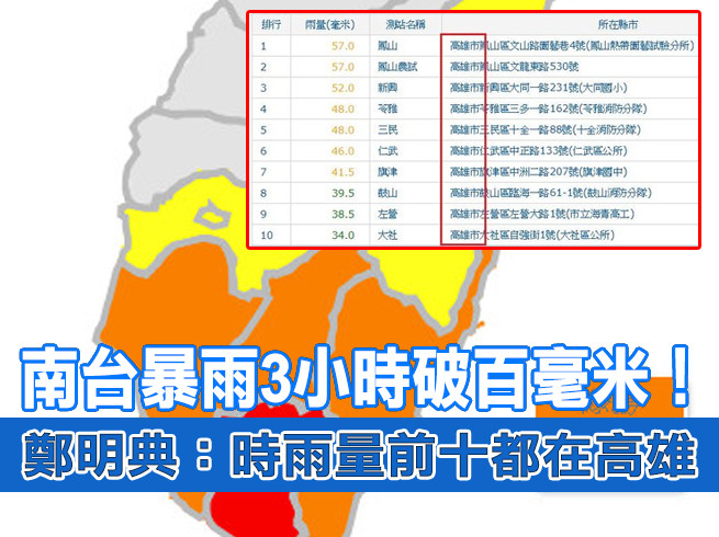 中央氣象局副局長鄭明典28日清晨5點46分在臉書PO出一張時雨量排名,發現前10名地區都落在高雄市,罕見的降雨情形也讓他忍不住提醒,「大面積比單點極端值更需要注意!時雨量排名全部是高雄市,想像一下,單一水龍頭水很大卻不容易累積,很多水龍頭一起開就很不一樣,看雨量紀錄要這樣想。」