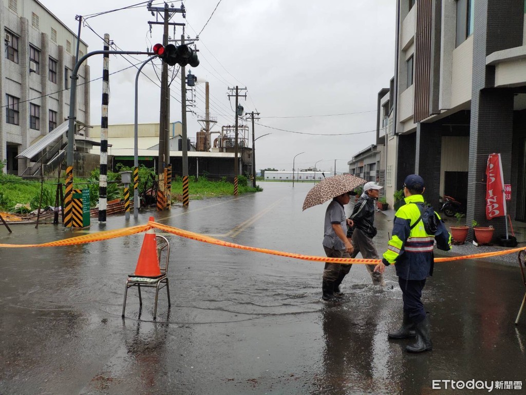 ▲屏東縣新園鄉港西村積水,警方在通往該村的烏龍村路口進行管制。(圖/陳崑福翻攝,下同)