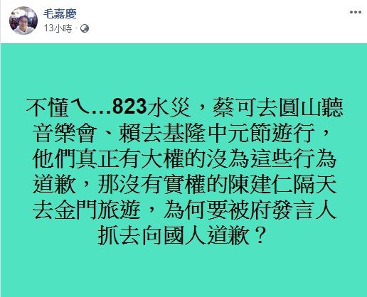 毛嘉慶表示,「不懂ㄟ…823水災,蔡可去圓山聽音樂會、賴去基隆中元節遊行,他們真正有大權的沒為這些行為道歉,那沒有實權的陳建仁隔天去金門旅遊,為何要被府發言人抓去向國人道歉?」雖然看似在幫陳建仁說話的貼文,實則狠酸蔡英文、賴清德。