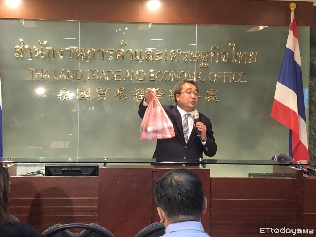 ▲駐台北泰國貿易經濟辦事處代表通才用塑膠袋諷刺旅行社跑腿就收300元。(圖/記者陳涵茵攝)