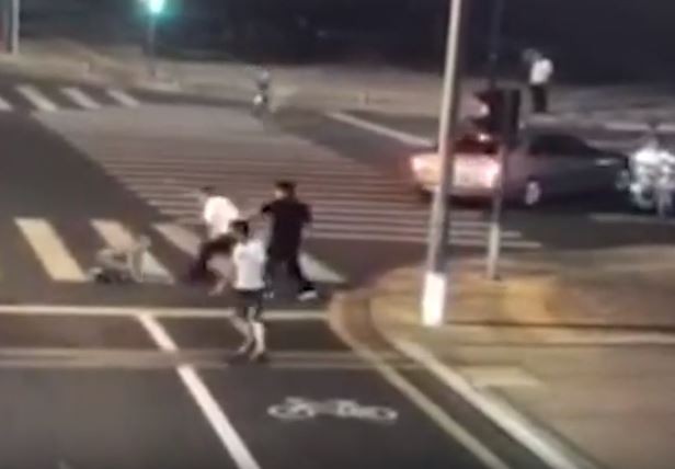 ▲騎士與BMW兩男在街上扭打成一團,其他路人嘗試勸架。(圖/翻攝自秒拍/北京時間)