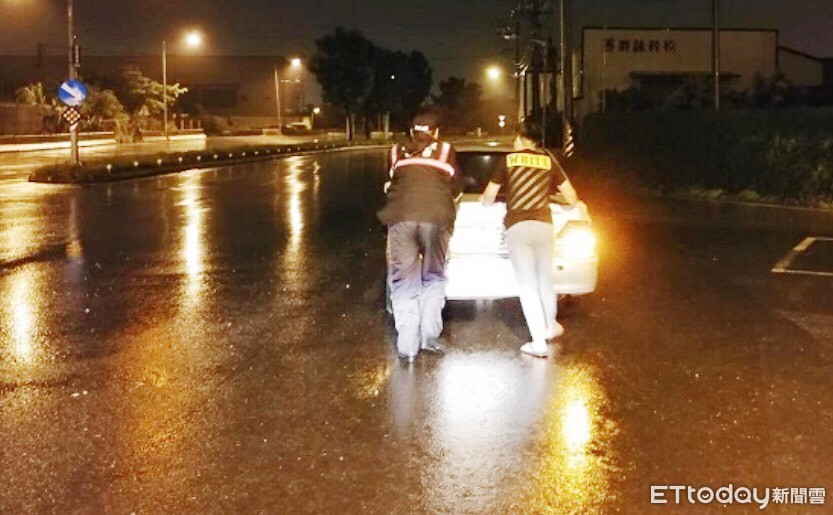 一名李姓駕駛日前開車行經路竹區復興路1133巷時,因雨勢實在又急又猛,竟然整台車半邊泡在水中,呈現傾斜姿勢,只好請求協助。員警發現後,主動協助推車,但無奈水溝太深,車輛還是無法脫困,於是協助通知拖吊車到場,將車輛拖離水溝脫困。
