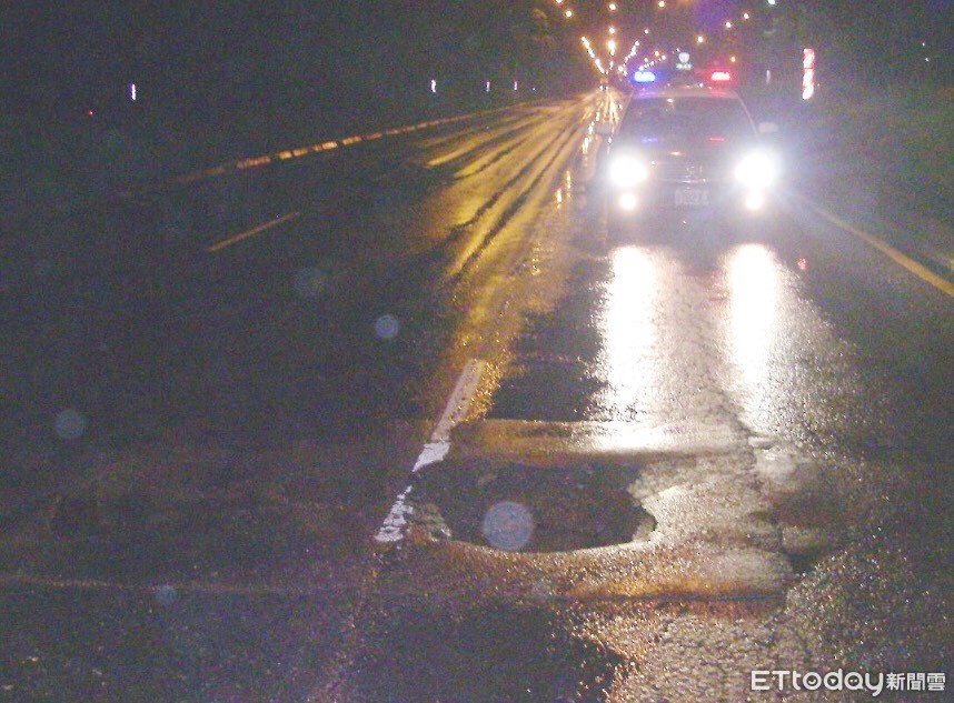 連續豪大雨炸高雄,許多地區都傳出淹水災情。有一名王姓女駕駛開車行經沿海三路28號對面南下快車道時,原以為只是路面積水,未料卻是一個坑洞,導致右前車輪破胎無法行駛。幸好員警及時到場,協助脫困,也避免後方車輛追撞。