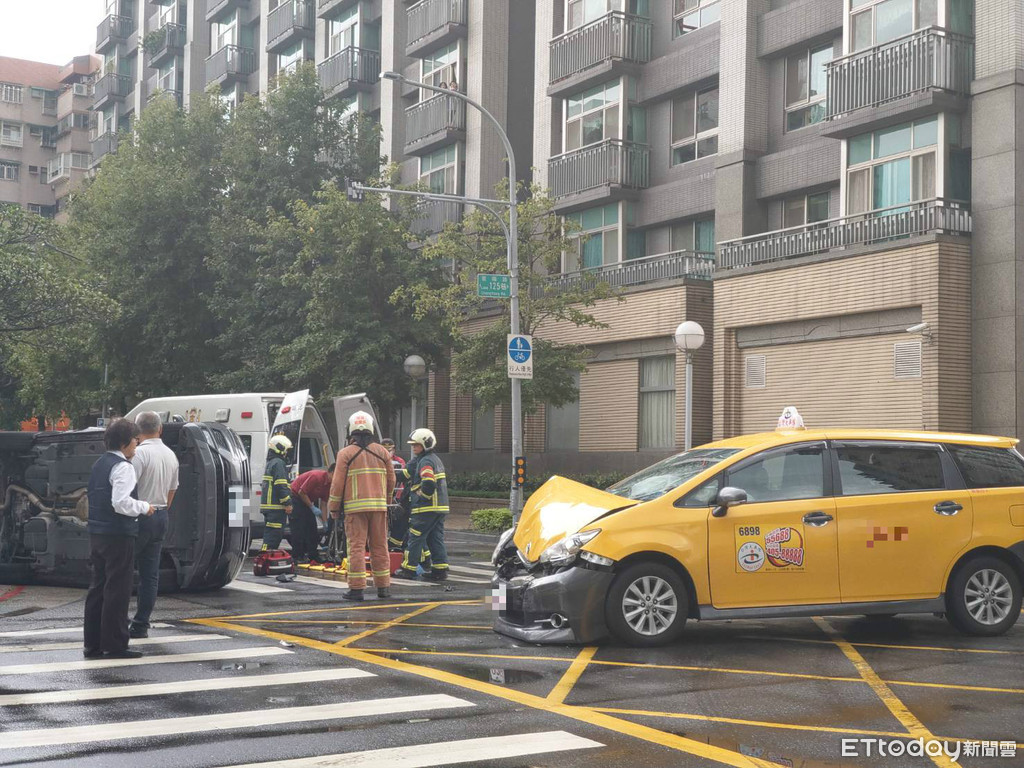 ▲休旅車與計程車發生碰撞,整輛車側立在馬路上。(圖/突發中心攝,下同)