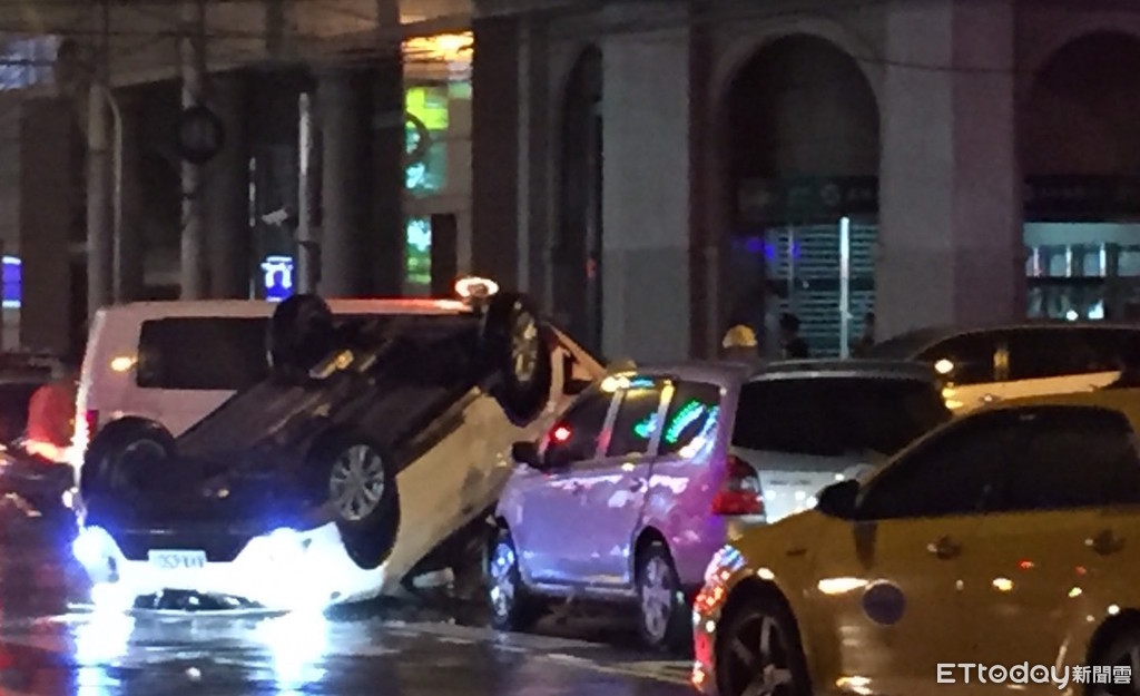 ▲白色休旅車翻覆後,頗及到一輛停紅燈的銀色小客車。(圖/記者陳玉翻攝)