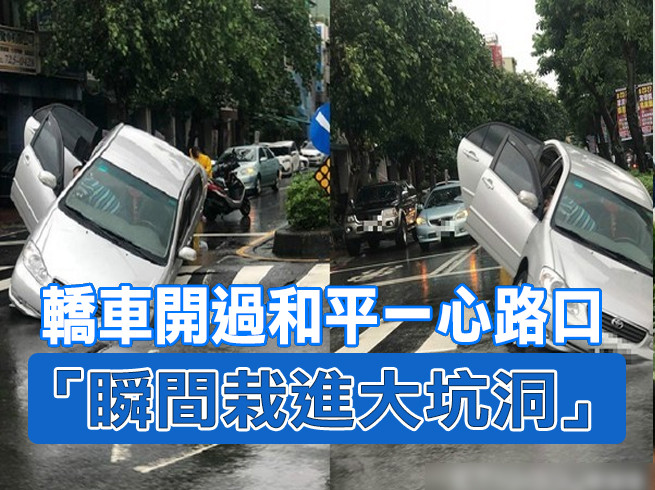 豪大雨猛炸南台,淹水災情不斷傳出,許多路段到處都是積水,就連路面也出現坑洞,引發民怨。有網友29日在臉書「爆廢公社」PO出數張照片,可見一台自銀色小客車才剛開過和平一心路口,下一秒竟直接陷進馬路中的大坑洞,畫面相當驚險。