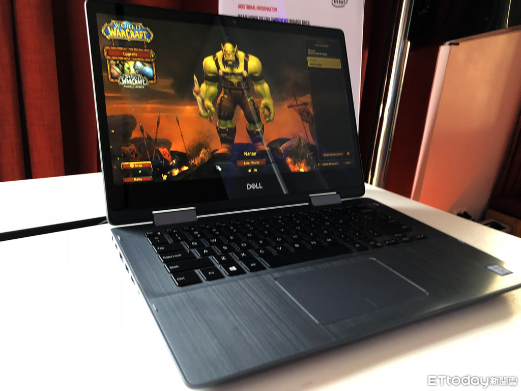 這次推出的三款Inspiron 7000,都採用二合一設計,相機放在顯示器的頂部,13吋和15吋機種可以選配UHD螢幕版本,搭載 intel 才剛宣布推出的 U 系列(代號 WhiskeyLake)處理器,現場展示的13吋版本搭載的是intel Core i7-8565U處理器,比起5年前的老電腦,效能快2倍、並有Gigabit 級的WiFi連線能力,網頁瀏覽效率提升 1.8 倍,並且都有8GB或16GB的 RAM 可以選擇,跑《魔獸世界:決戰艾澤拉斯》、《戰鎚》以及《戰車世界》也不是問題。