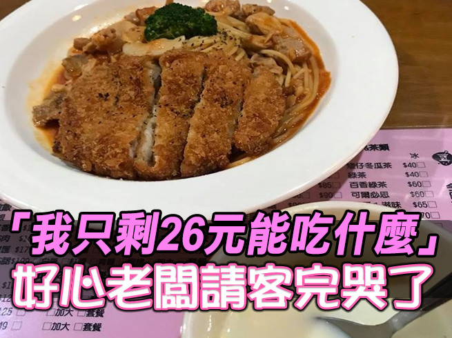 雲林一名餐廳老闆遇到一名自稱全身只剩26元的顧客,他好心弄食物給對方「吃飽吃滿」,結果客人後來的舉動讓他難過地哭了,「這就是台灣人的素質嗎?呵呵,總結難怪常常有人說別管太多閒事。」對此,許多網友打氣說,「好心會有好報的!好運會降臨在你身上」;還有人想起大學教授說的一段話,「0分也有不同」,引人深思。