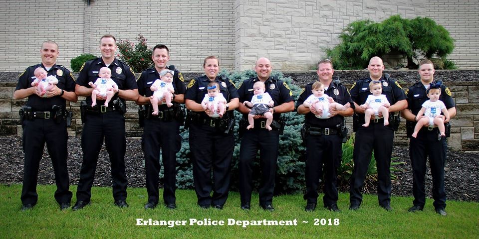 美國肯塔基州厄蘭格市(Erlanger)警局同一部門的8名員警在過去一年的時間裡,一起升格當爸媽,這群7男1女的組合也決定帶著孩子一起拍照留念,甚至在臉書點名奧克拉荷馬州葛蘭普爾市(Glenpool)消防局的7名爸爸並開玩笑提到,「我猜肯塔基州厄蘭格市的水也有問題。」