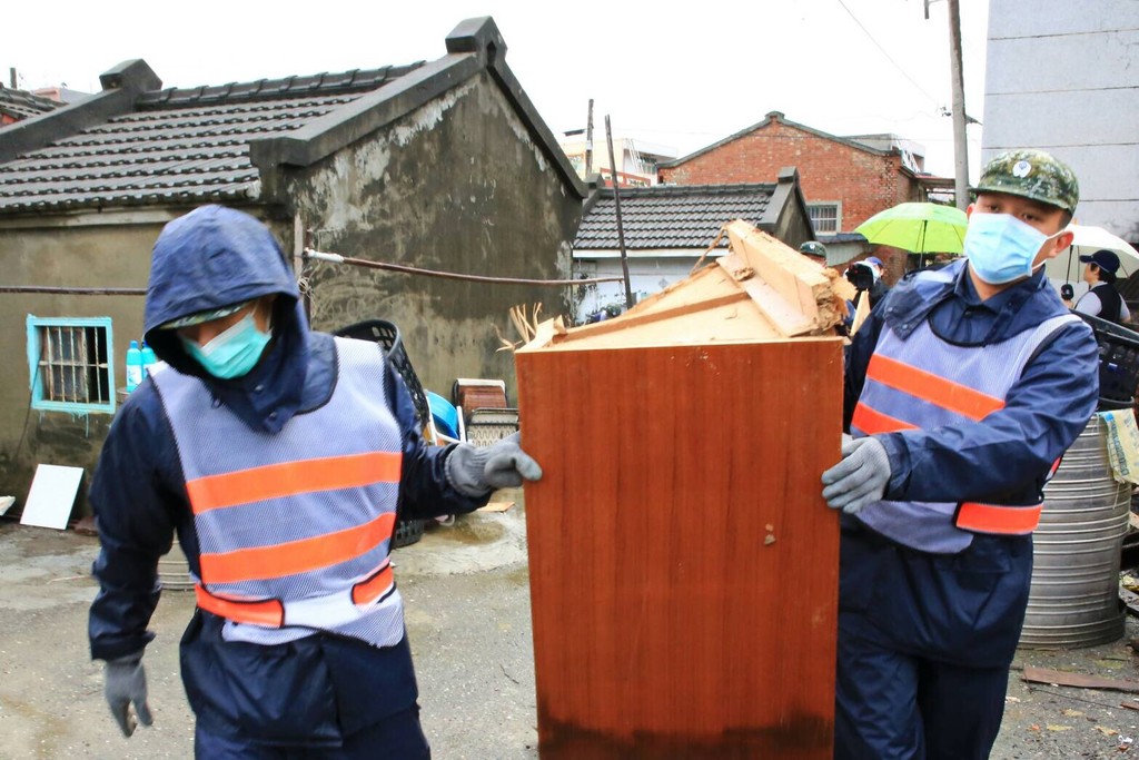 30日上午大林慈濟醫院持續在東石鄉掌潭村保安宮前開設醫療站,為忙於清理家園的民眾及前來協助的國軍官兵提供醫療服務。大林慈濟醫院院長賴寧生及慈濟嘉義東石掌潭勤務志工,代表捐贈250雙防穿刺手套及300雙防穿刺鞋墊給協助清掃的國軍官兵,由國軍南測中心指揮官劉沛智代表接受。