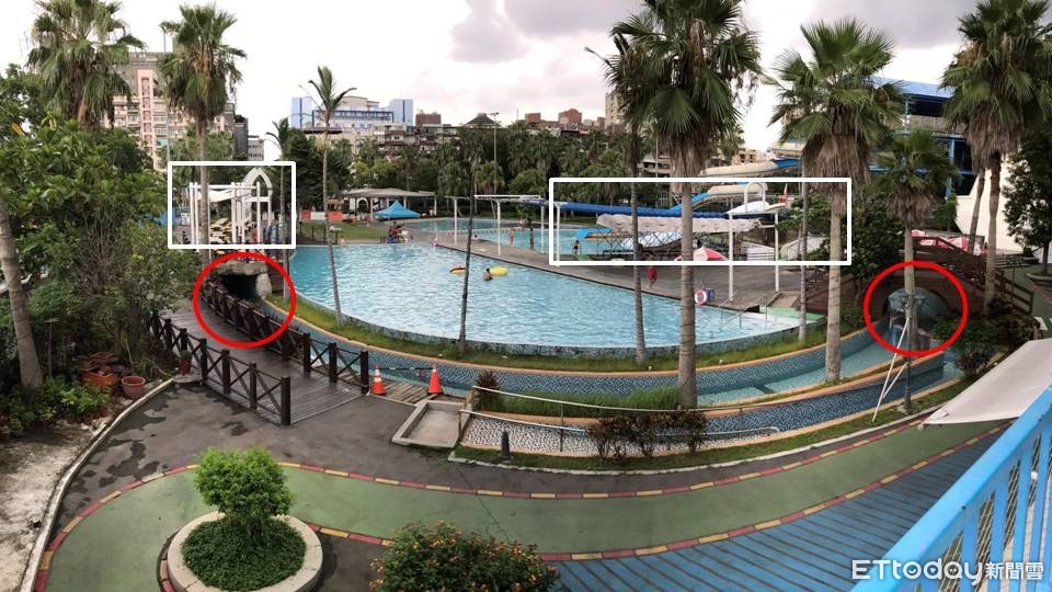 從現場圖來看,漂漂河環繞整個戶外戲水區,全長250公尺,水深60至90公分,事發現場的河洞長10公尺、高約3公尺(由水底置頂部),若是乘坐游泳圈進入後,至少需要20秒才會從出口離開。一般而言,家長如果沒有跟著小朋友一起在漂漂河內的話,多半會在休息區等待,但是可以看到,漂漂河左邊有個山洞,右邊則是拱橋,這2處就是漂漂河的視線死角,而2個休息區不是在洞穴的上方,就是有段距離,家長如果只是偶爾「看一眼」,當孩子漂進洞穴中,就等於死角區域,而且危險時間長達20秒。