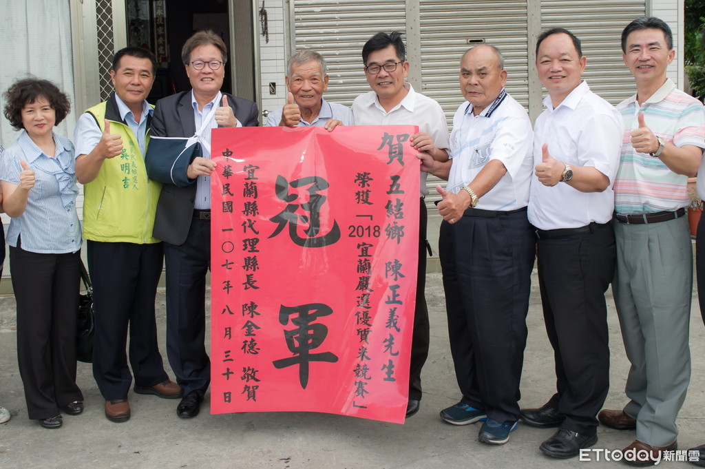 ▲首屆宜蘭嚴選優質米競賽冠軍出爐,宜蘭代理縣長陳金德特地前往陳正義農友家中道賀。(圖/記者游芳男翻攝)