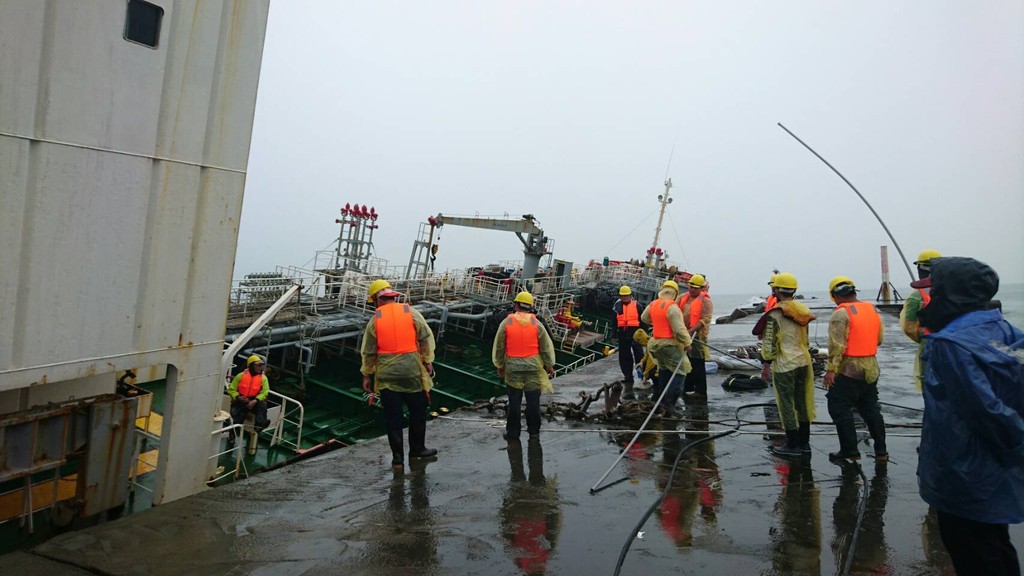 擱淺在堤外的飛龍輪,因該輪機艙進水,作業人員於現場評估其他可行抽油方式。但由於擱淺船舶附近風浪狀況仍無法佈設攔油索,抽油作業區周邊均已備妥吸油棉等防污資材,以防不慎洩漏時可即時除污。