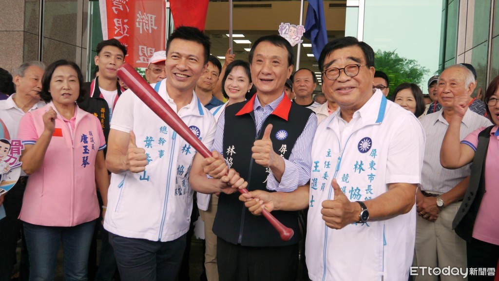 ▲國民黨徵召屏東市長參選人林恊松和競選總部部主任委員前立委王進士(右)、總幹事也是屏東市前市長葉壽山(左二) 共同持球棒,宣誓出擊。
