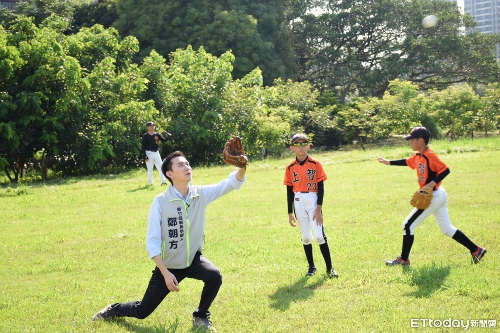 鄭朝方1日出席「紅樹林盃社區棒球」邀請賽,向在場的參賽者、年輕爸媽,說明他的「全民體育」、「選手培育」與「運動行銷」三項體育政策。