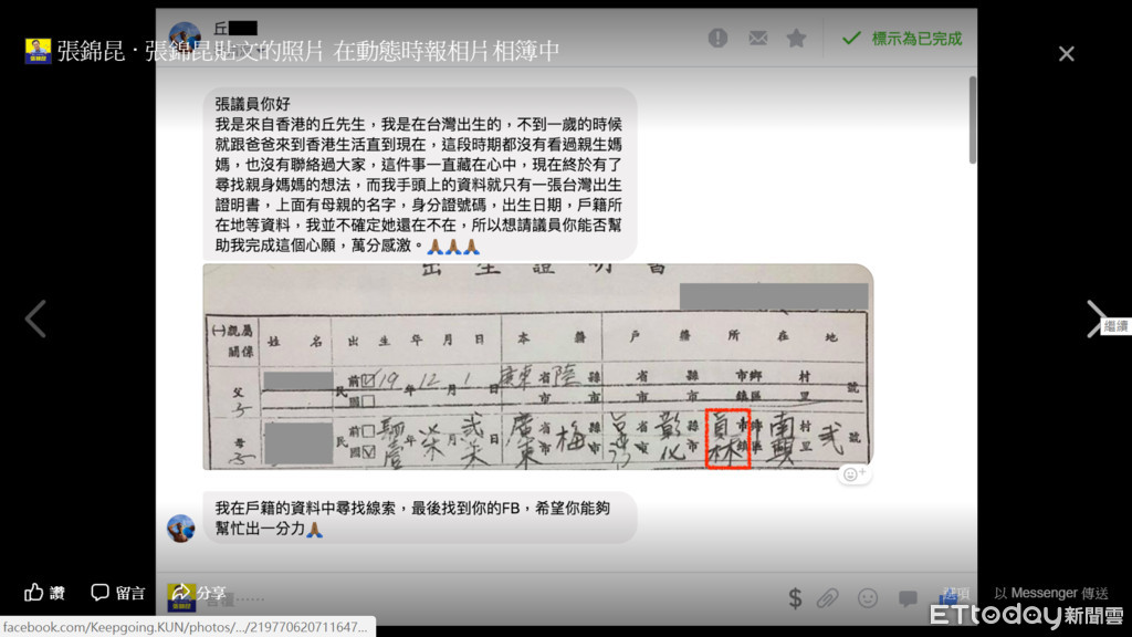 張錦昆表示,在香港長大的丘先生自小與台灣母親分離,心中一直有尋找媽媽的念頭,憑著片段的記憶透過網路不停的搜尋,終於拼湊出一個線索,原來員林是他的故鄉,於是尋母心切的他不放過任何蛛絲馬跡,後來他搜尋到他經營的臉書粉絲專頁,於是私訊請託能夠幫忙他跨海尋親,完成心願,他則商請戶政機關協尋。