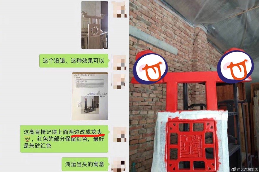 這個顧客提到他在8月中向「劉氏工坊傢俱」訂製了一張高背椅,他很仔細地告訴業者想要的圖案,先是傳了一張有龍頭椅背的照片,表示自己想要的這種感覺,訊息寫道,「這高背椅記得兩邊改成龍頭,紅色的部分保留紅色,最好是硃砂紅色,鴻運當頭的意思」。這名顧客除了傳範本之外,在「改龍頭」那句話後面,還加了個龍的表情符號。