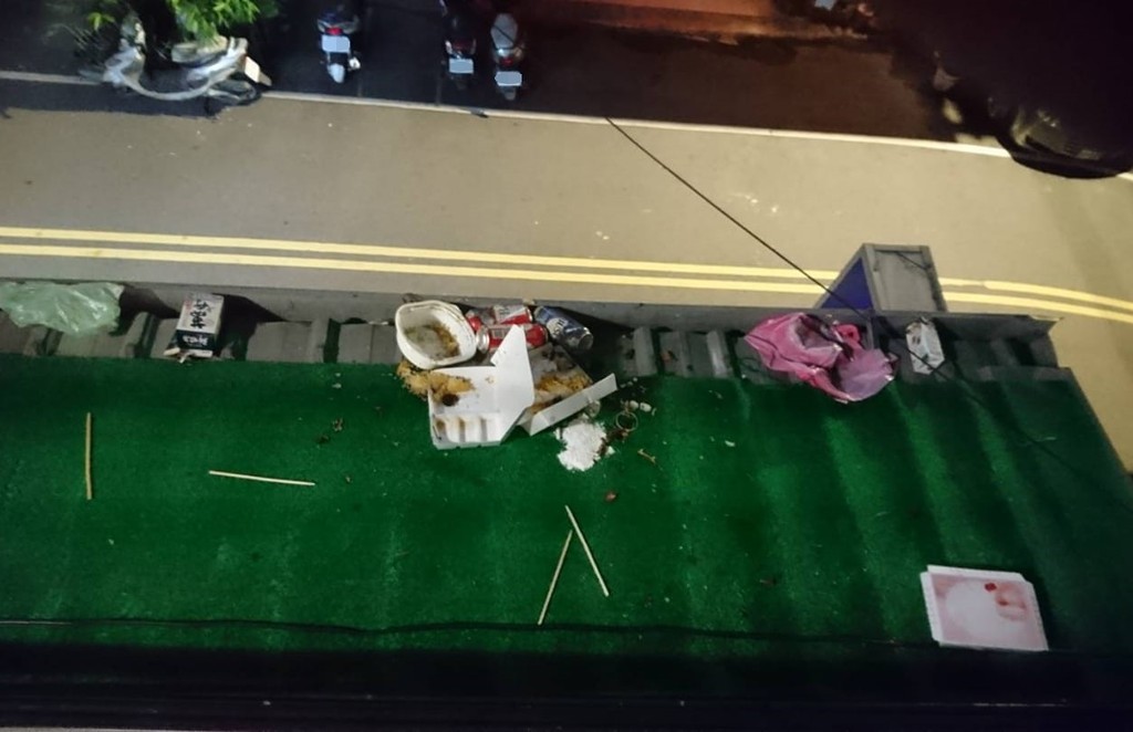 照片中,只見遮雨棚上掉落4個便當盒、5瓶飲料空罐以及一些零散的垃圾,其中便當盒裡還有沒吃完的飯菜,掉落時撒得到處都是,看起來相當髒亂。