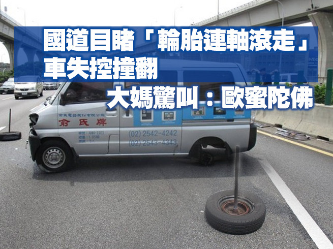 國道一號北上桃園路段49K處,1日中午12時許發生翻車事故,一輛客貨車行經該地時整顆左後輪竟脫離車身,整顆噴飛空中,失控的車輛搖晃後擦撞側邊護欄翻覆,所幸只有頭部輕微擦傷;而整起事故都被後方的行車紀錄器給拍下,目睹車禍的阿姨以台語口音尖叫「歐蜜陀佛、歐蜜陀佛,啊~~」誇張受驚反應成網友焦點。