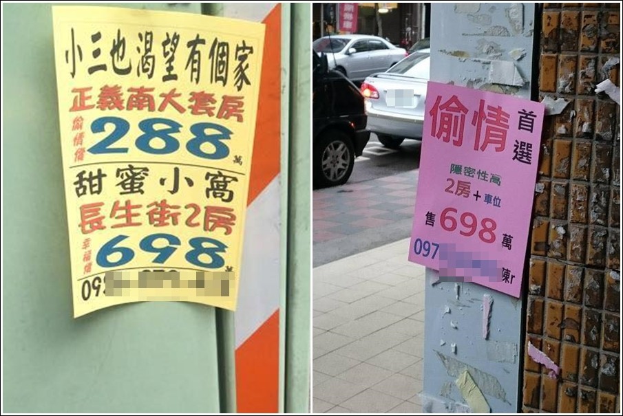 網友上傳兩張照片至臉書社團「路上觀察學院」,透過照片可以看到,有一張黃色傳單上寫「小三也渴望有個家」正義南大套房偷情價288萬元;「甜蜜小窩」長生街2房幸福價698萬元。另一張粉紅色傳單上寫大大4個字「偷情首選」隱密性高,2房還有車位,售價為698萬元,並附上聯絡電話。