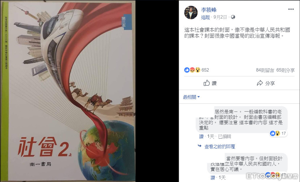 台北教育大學教授李筱峰日前在臉書PO文指出,南一書局出版的國二社會課本,出現大陸東方明珠、和諧號高鐵等圖樣,課本封面「很像中國當局的政治宣傳海報」。南一書局則表示,教科書內容為大陸史地,因此封面素材與大陸相關,並非教授李筱峰擔心的「像中國當局的政治宣傳海報」。