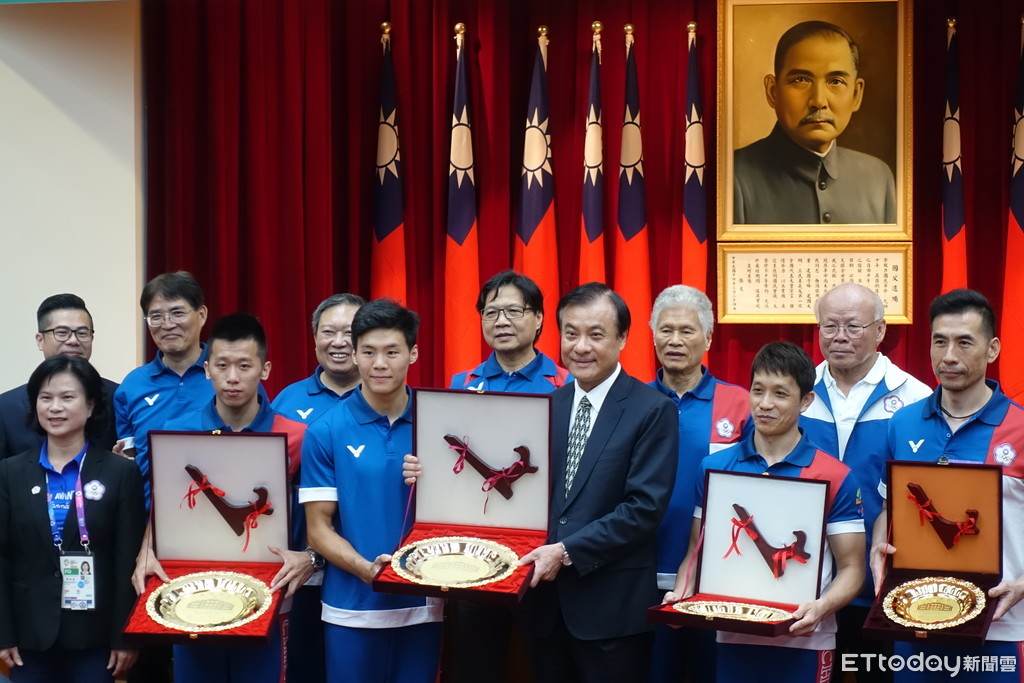 ▲蘇嘉全與亞運體操隊選手李智凱、教練林育信等人合影。(圖/記者翁嫆琄攝)