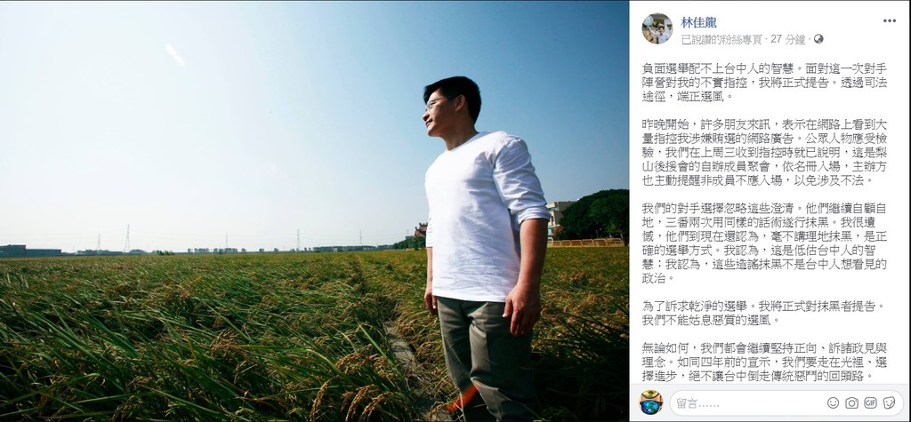 ▲林佳龍對於對手頻頻不實指控,首度在臉書發表看法。(圖/取自林佳龍臉書)